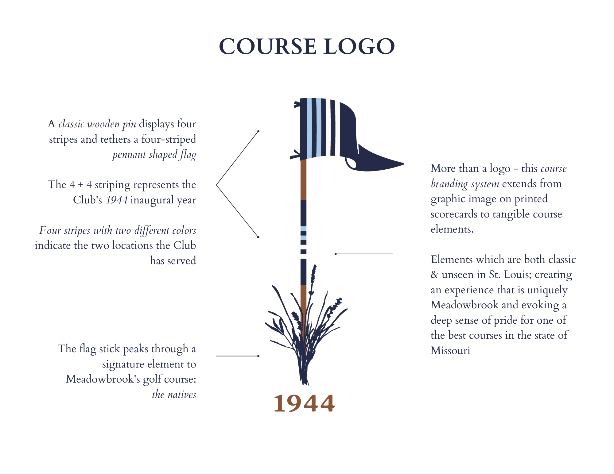 Our new brand is much more than a logo - this branding system extends from graphic image to tangible course elements while paying homage to the Club's history and tradition. Whether you see the marks on apparel or pull the wooden stick out of the cup, the feeling is the same: a deep sense of pride for one of the best courses in the state of Missouri.